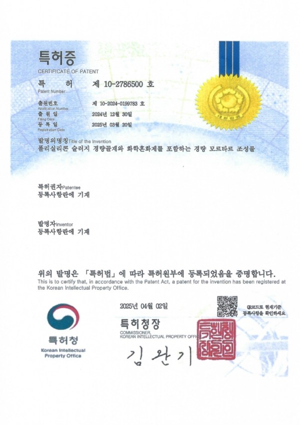 특허증 (특허 제 10-2786500 호)