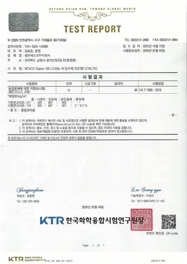 동결융해 저항성 시험성적서 (2026년) Supex 100 (CX0.7%)